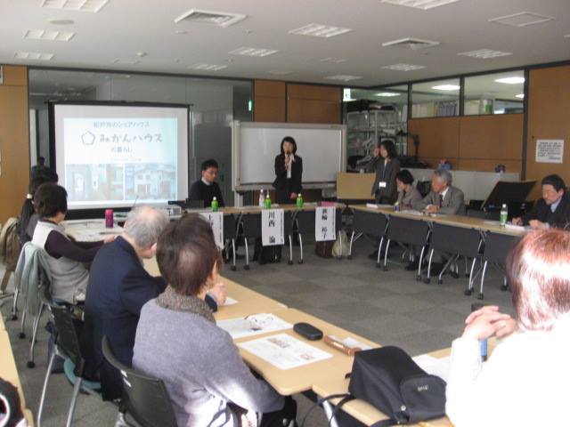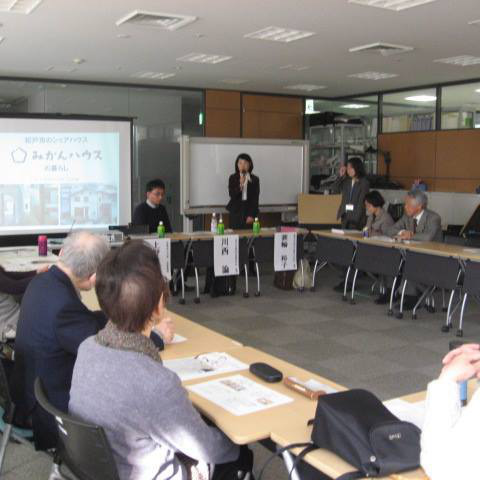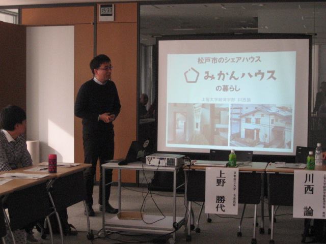 川西先生には、現在松戸市内で運営されているシェアハウスについて、「松戸市のシェアハウス みかんハウスの暮らし」と題して発表をしていただきました。「みかんハウス」のみかんとは、「空間を居住者と共につくっていく」という意味を込めて、「未完ハウス」という言葉を平仮名に直して使ったそうです。