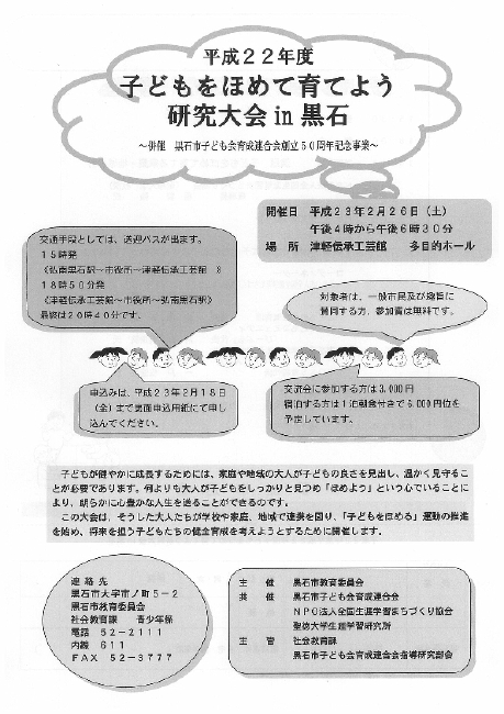 TOP > 研究・実践事業 > 2010年(平成22年) > 子どもをほめて育てよう研究大会in黒石