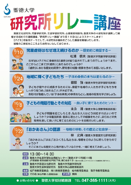 聖徳大学言語文化研究所、児童学部研究所、生涯学習研究、心理教育相談所の所長たちによる「いま、いちばん伝えたいメッセージ」を皆様にお届けいたします。