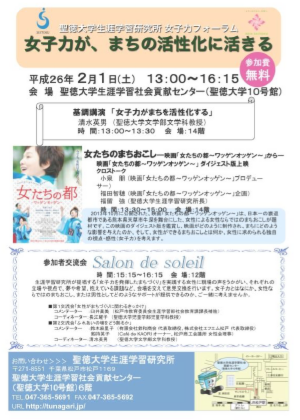 TOP > 研究・実践事業 > 2013年(平成25年) > 聖徳大学生涯学習研究所主催「女子力フォーラム」 女子力が、まちの活性化に活きる