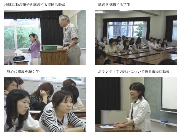 る市民活動家を招待し、地域での活動の様子やボランティア活動への思い等を、学生の前で語ってもらいました。まだボランティア活動を行なったことのない学生にとって地域の活動を垣間みることは有意義な授業となりました。これは、大学と地域の連携の研究として行なったものです。市民の方の学生を育てようという気持ち、伝えたい気持ちが克明に記録されています。